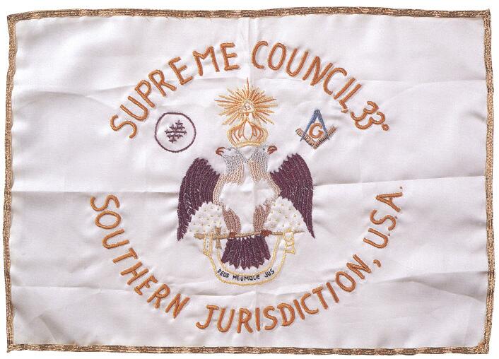 Aldrin also carried a handmade silk Masonic flag with him on his space journey, embroidered with the words, “Supreme Council, 33°, Southern Jurisdiction, USA.” After his mission in 1969, Brother Aldrin visited the House of the Temple in Washington, DC, and presented the flag to Grand Commander Luther Smith. The flag is now located in the archives of the House of the Temple.