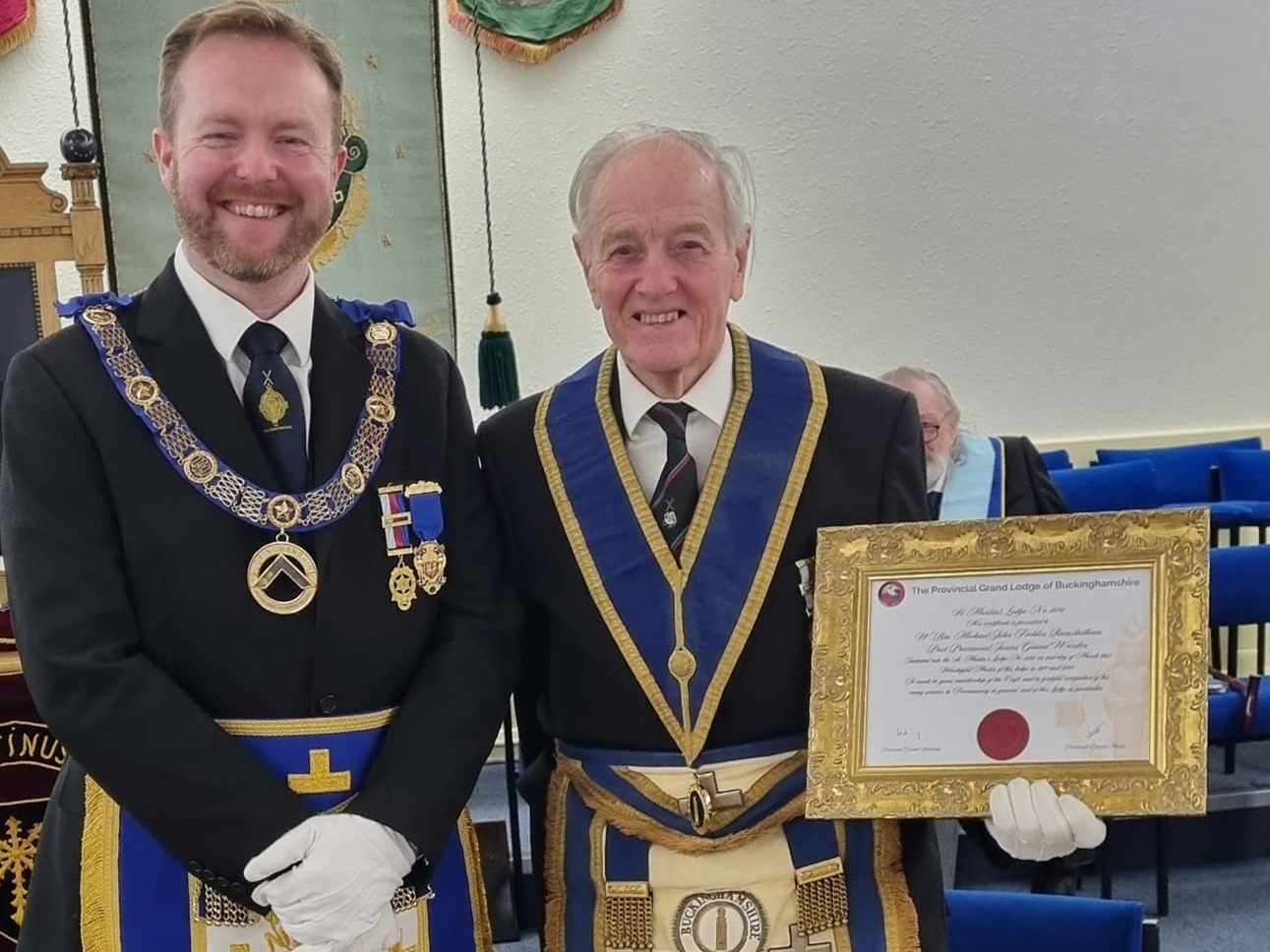 Leo is one of the most beloved characters in Buckinghamshire Freemasonry (and beyond), and his humour and charm really showed throughout the entire meeting. At the spritely age of 89, and exactly 55 years to the day that he was initiated, Leo finally made it!