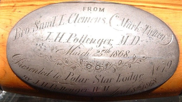 Phoenixmasonry.org reports that Twain “sent his lodge a gavel with this note: ‘This mallet is a cedar, cut in the forest of Lebanon, whence Solomon obtained the timbers for the Temple.’