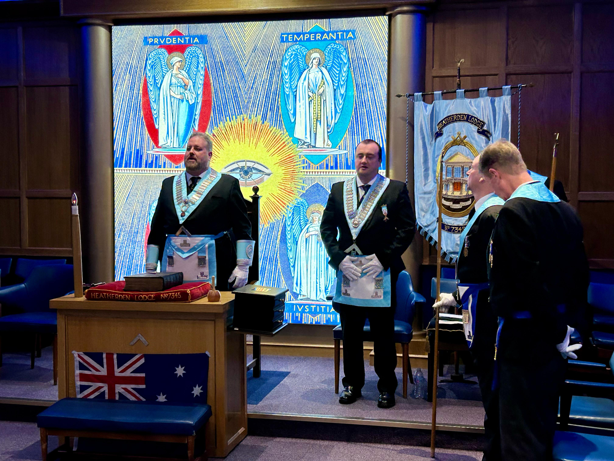 The Lodge’s banner features the crossed keys of St. Peter on a lozenge, situated between two great pillars, symbolizing the Lodge's connection to its namesake saints. The banner includes several elements: the Lodge name and number in gilt lettering on a red background with gold edging, the all-seeing eye with irradiation, the date of consecration on a pale blue banner with gold edging, and the square and compasses open in the 3rd degree. The chequered pavement, heavy maul, level, plumb rule, and additional square and compasses are also depicted, indicating the Masonic virtues of balance, fairness, and integrity. These symbols are set against a royal blue background, bordered by blue and gold tassels, with cords and tassels in matching colours framing the sides.