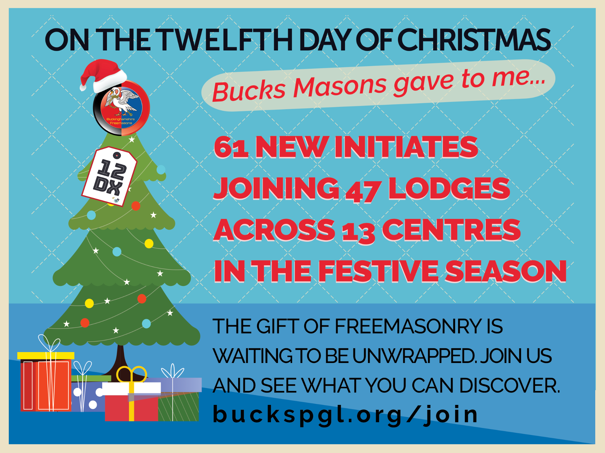 12DX is Buckinghamshire's festive drive to welcome 60 new members to Freemasonry. We have raised our membership levels for the previous four years in a row, and we are running far above the national average. This year, we are on track to reach our highest growth in over ten years, thanks in large part to the committed people in the Buckinghamshire Freemasons who devote their time and effort to attracting more good people to join us.