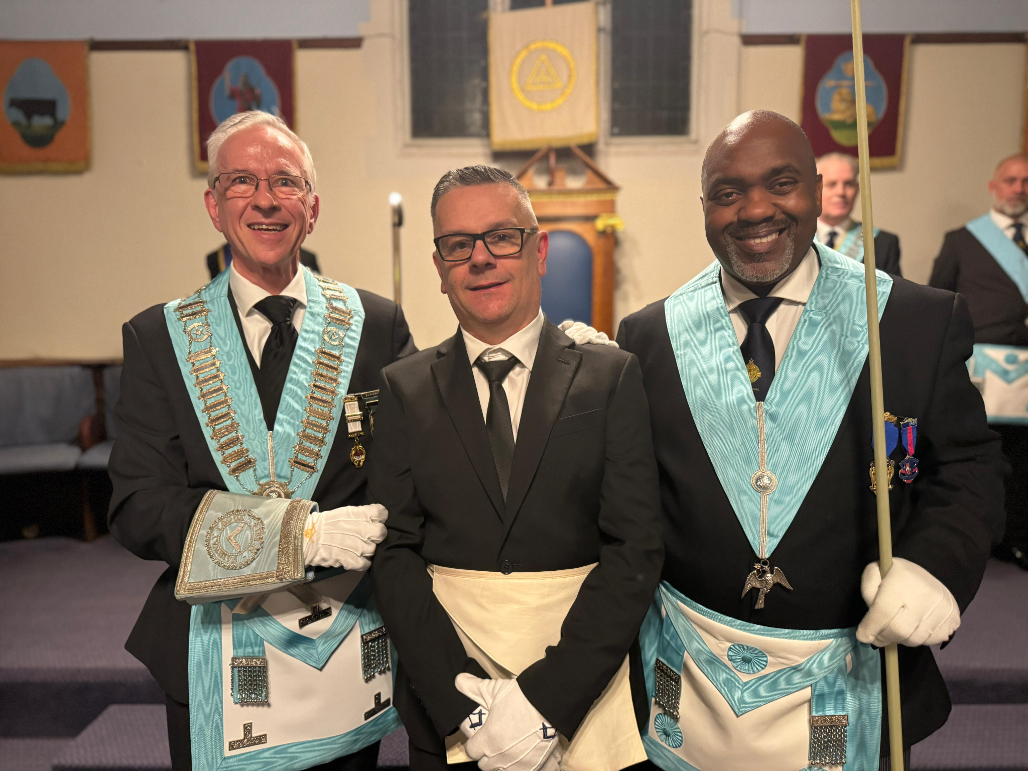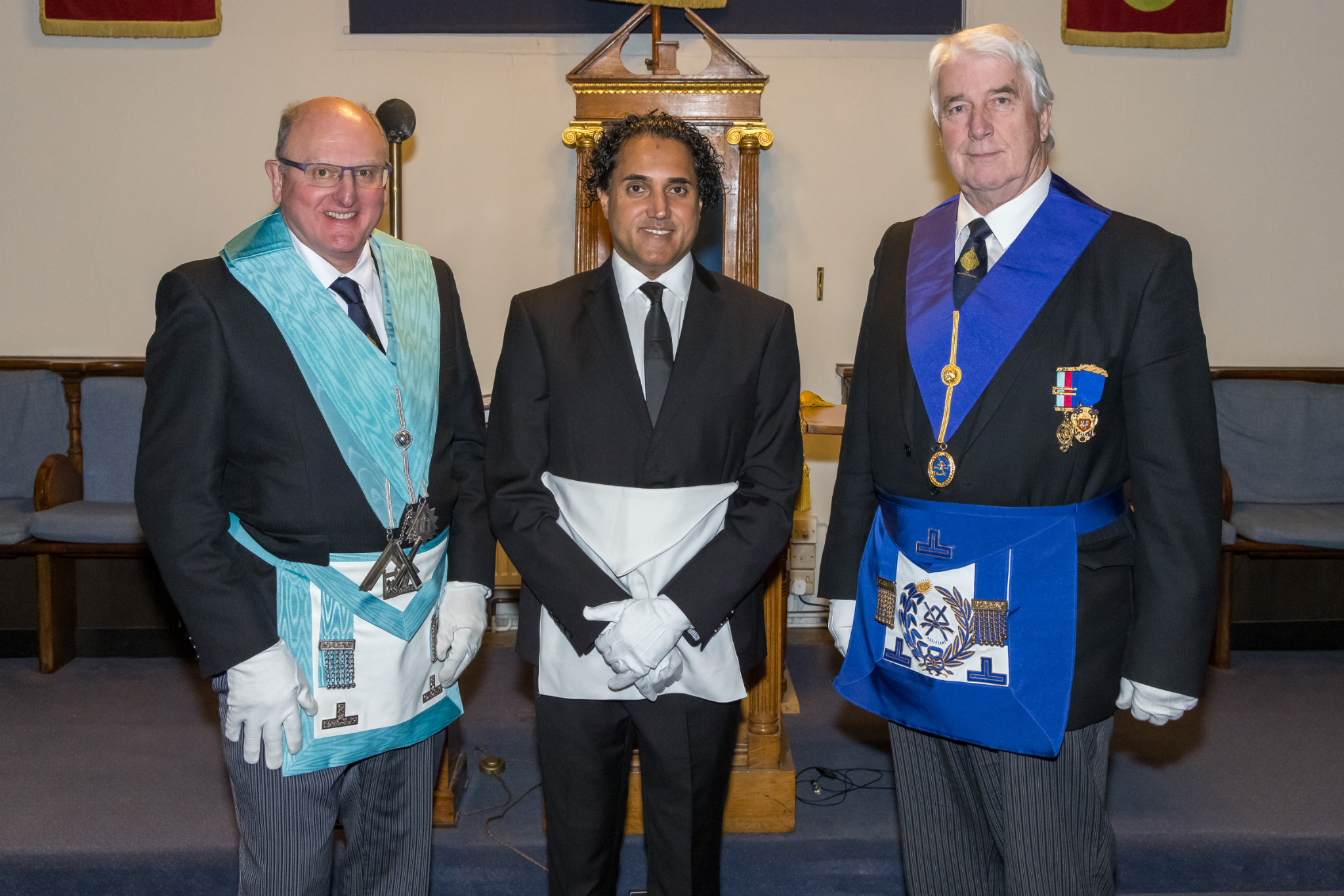 Throughout the evening, three separate experienced Freemasons took turns initiating a single candidate each. One observer noted how unusual it was to see each candidate initiated by a different master. "It was a wonderful experience for our three newest members of the province, and the ceremonies were delivered in impeccable fashion."