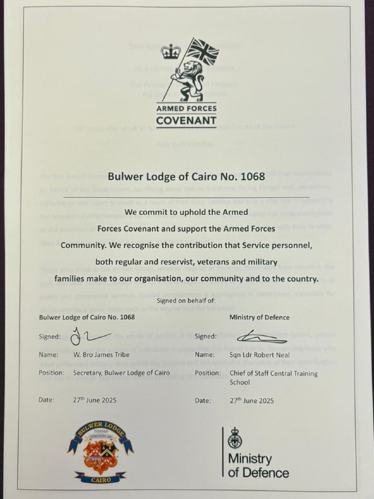 Friday evening marked a significant milestone in our Province's commitment to supporting the Armed Forces Community. Bulwer Lodge of Cairo and the recently repurposed Royal Thames (Combined Services) Lodge, supported by the RW Provincial Grand Master and a whole team of APOs, attended the official signing of the Armed Forces Covenant (AFC).