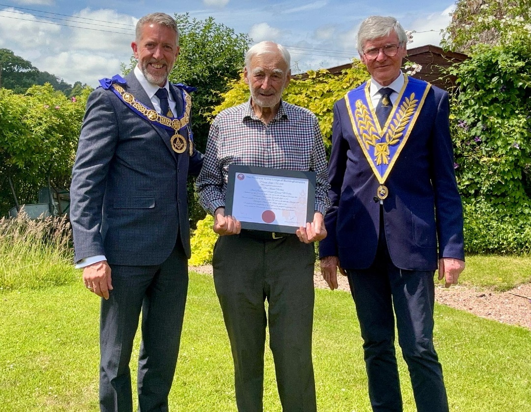 Recently our Provincial Grand Master, Tim Anders, had the pleasure of travelling from Oxfordshire to Wiveliscombe in Devon with Frank Byrne to visit Brother Brian Tustian and present him with his certificate for 60-years in Freemasonry.  They shared a memorable afternoon with Brian, enjoying fish and chips from the local chippy and a walk around his beautifully kept garden. The visit was filled with good conversation and great memories of Brian’s remarkable Masonic life.