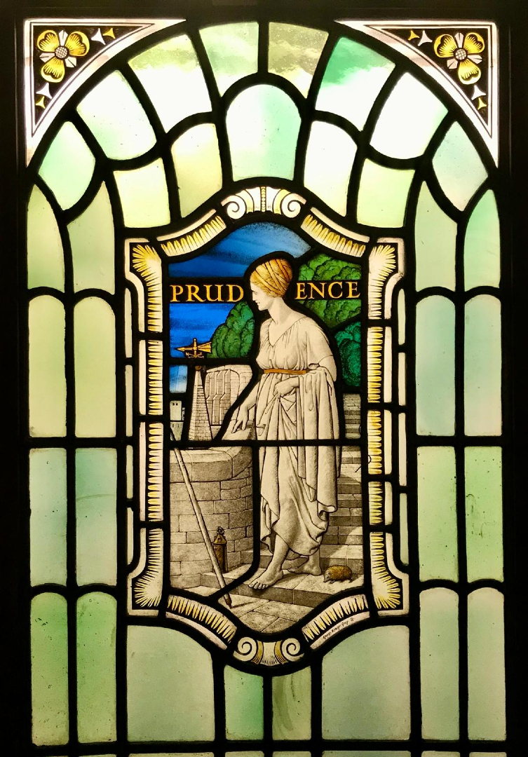 In the Processional Corridor of Freemasons’ Hall, a beautiful stained glass window captures this virtue in stunning symbolic form. Created by the renowned artist George Kruger Gray, the piece is a fine blend of classical elegance and rich Masonic meaning. The vibrant blues and greens of the natural landscape provide a vivid contrast to the gentle, neutral tones of Prudence’s robe, offering a sense of calm balance — a perfect visual expression of her nature.