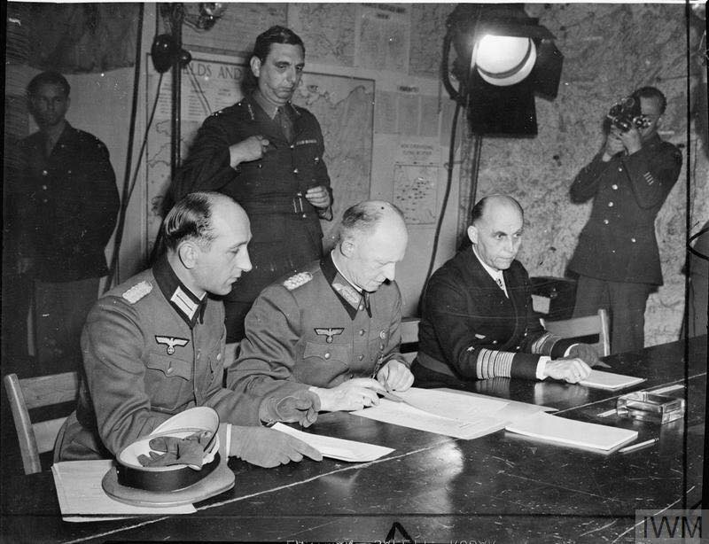 The act of military surrender was first signed at 02:41 on 7 May in SHAEF HQ at Reims, and a slightly modified document was signed on 8 May 1945 in Berlin.