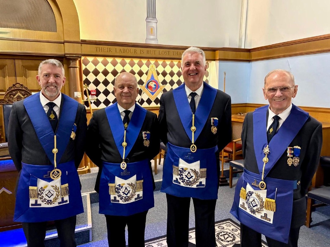 Current Provincial Grand Master, Tim Anders, stood alongside the three past provincial Grand Masters of Buckinghamshire - John Clark (2018~2025), Gordon Robertson (2011~2018) & Ray Reed (2005~2011).