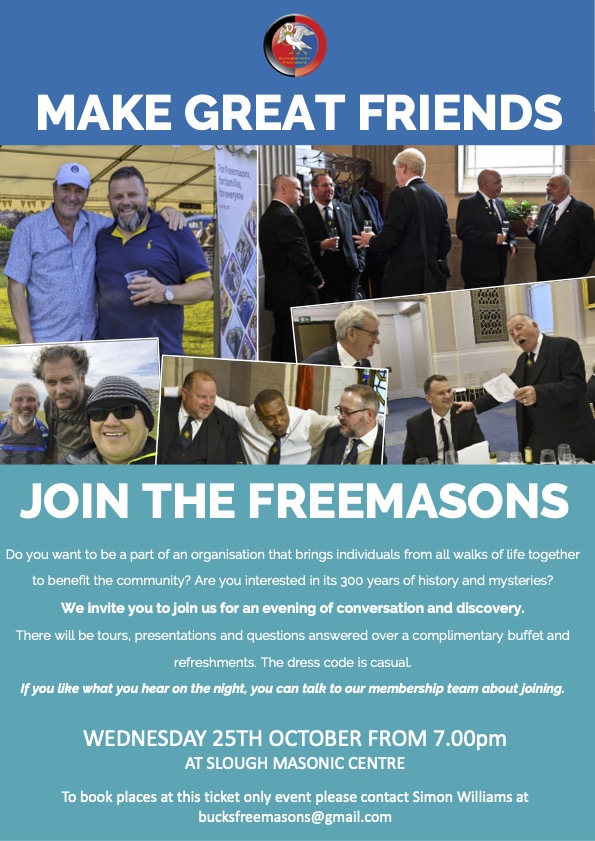 On Wednesday 25th October we are holding a free-to-attend Join the Freemasons event in Slough Masonic Centre on Ragstone Road on Wednesday 25th October starting at 7 pm.