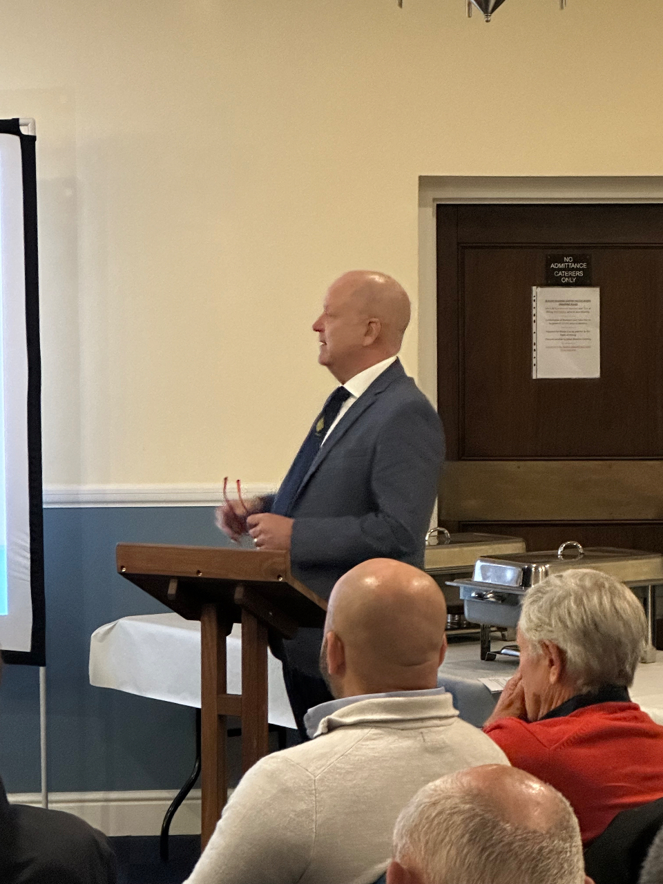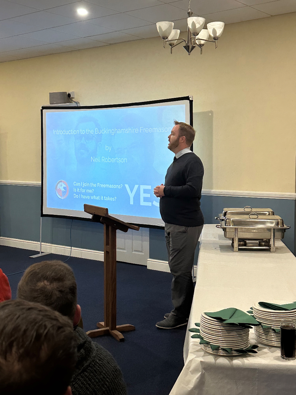 After a short reception we sat down for a presentation from a wealth of experienced speakers that are Freemasons. The first of which being an introduction by Deputy Provincial Grand Master Neil Robertson, who explained who he is and gave a great insight into what Freemasonry is. The Assistant Provincial Comms Officer Lee Buckingham, followed, explaining the details of who we are, our beliefs, rules and priorities that are so important to us. Provincial Membership Officer John Palman followed explaining the details of what goes on at lodge meetings, including the meeting agenda, ceremony and the all important festive board (dinner!).
