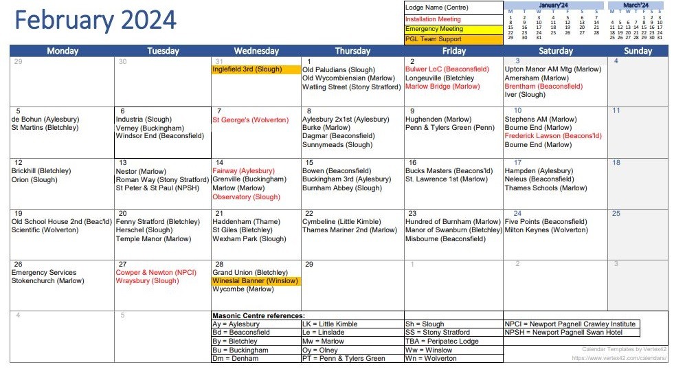 The lodge also has meeting planned for March, St Patrick’s Festive Board and April, St George’s Festive Board