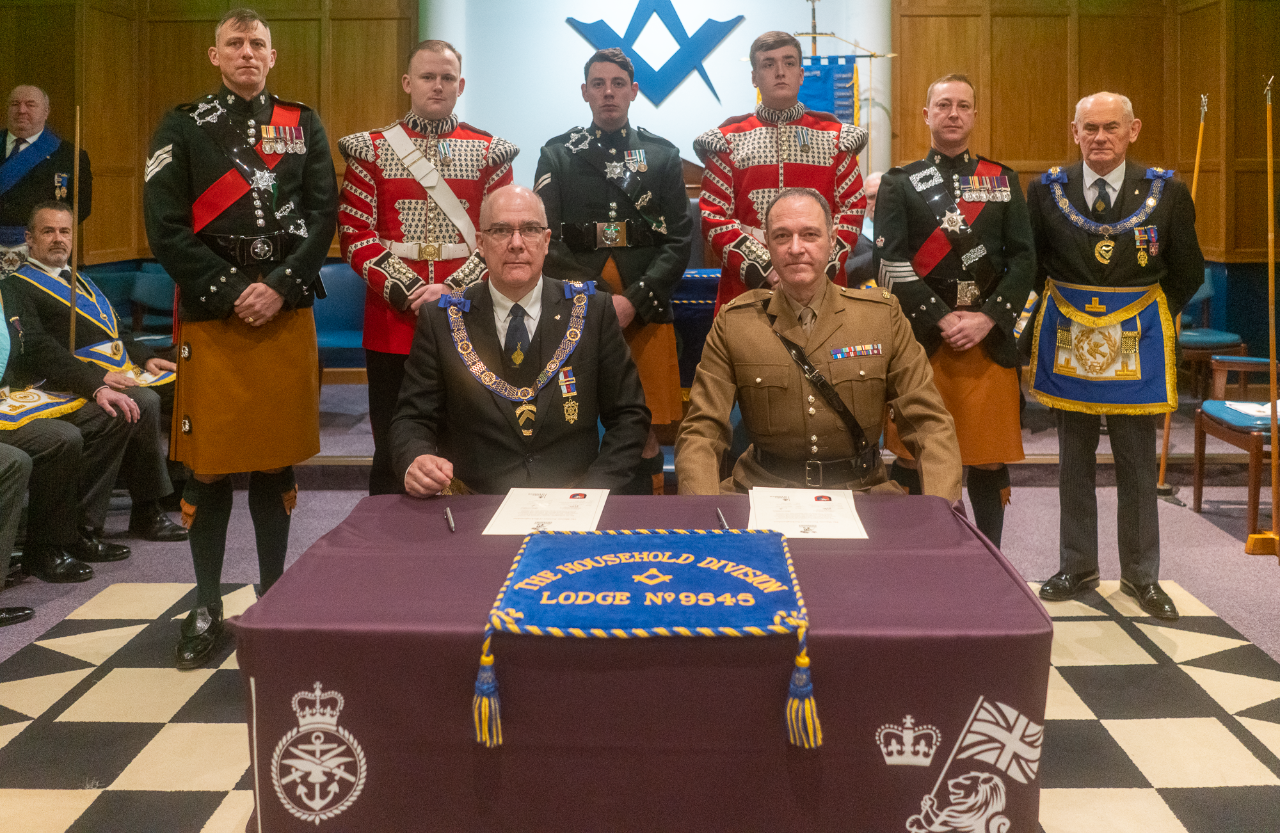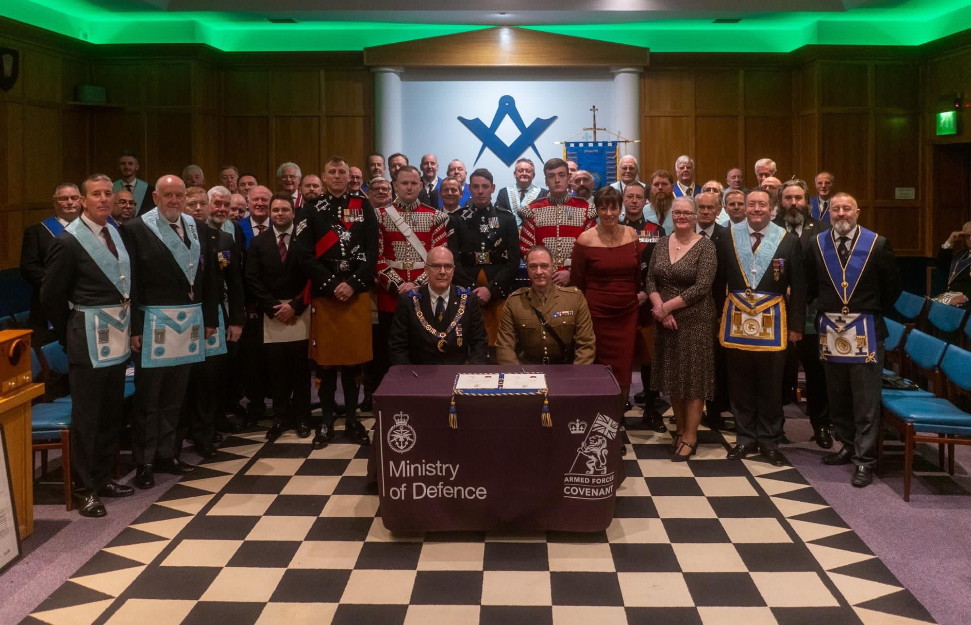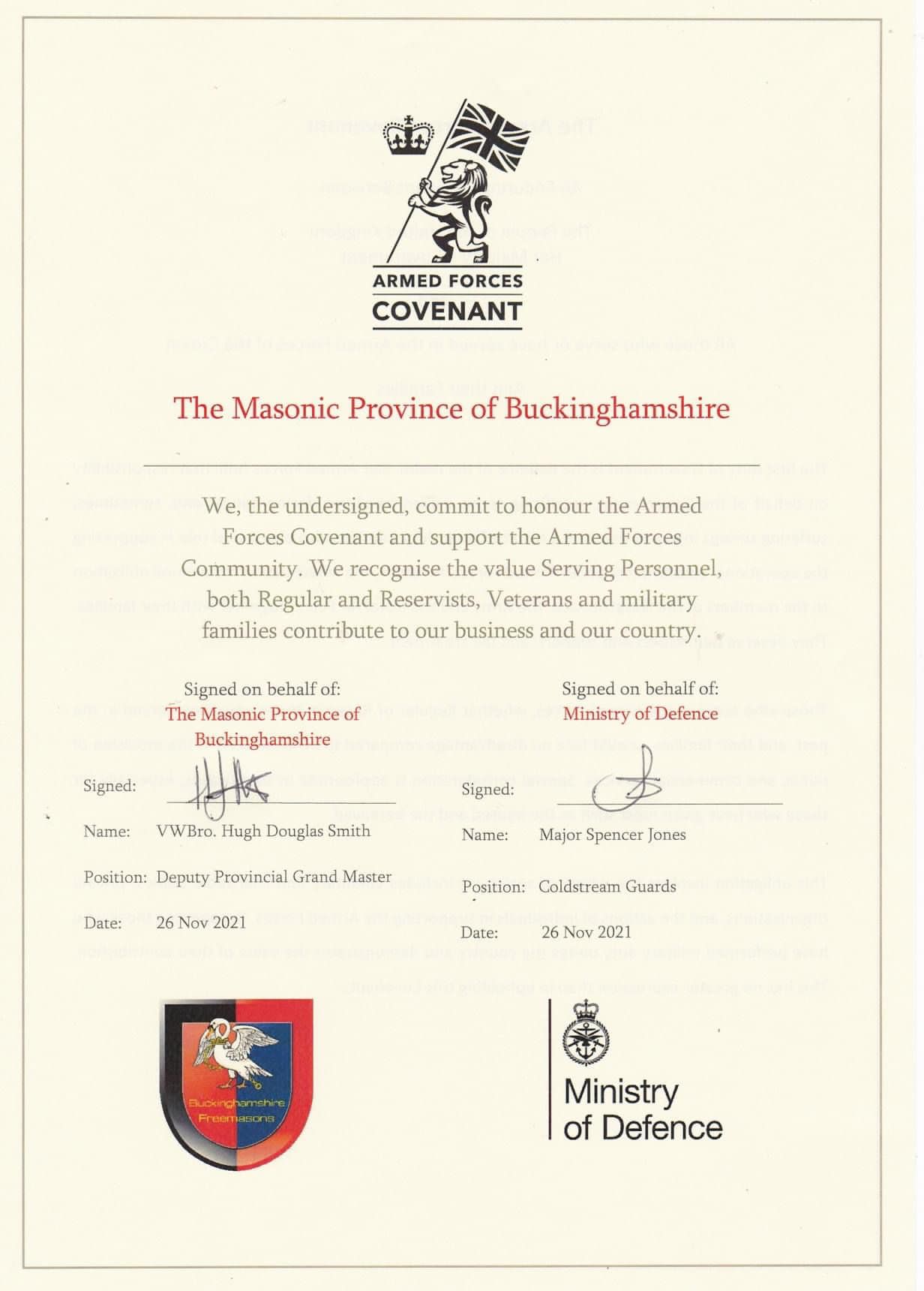 DPGM on behalf of Province and Major. Spencer Jones (Coldstream Guards) on behalf of the Ministry of Defence, the covenant is displayed at every Lodge meeting to signify the commitment to the Armed Forces and Veterans.