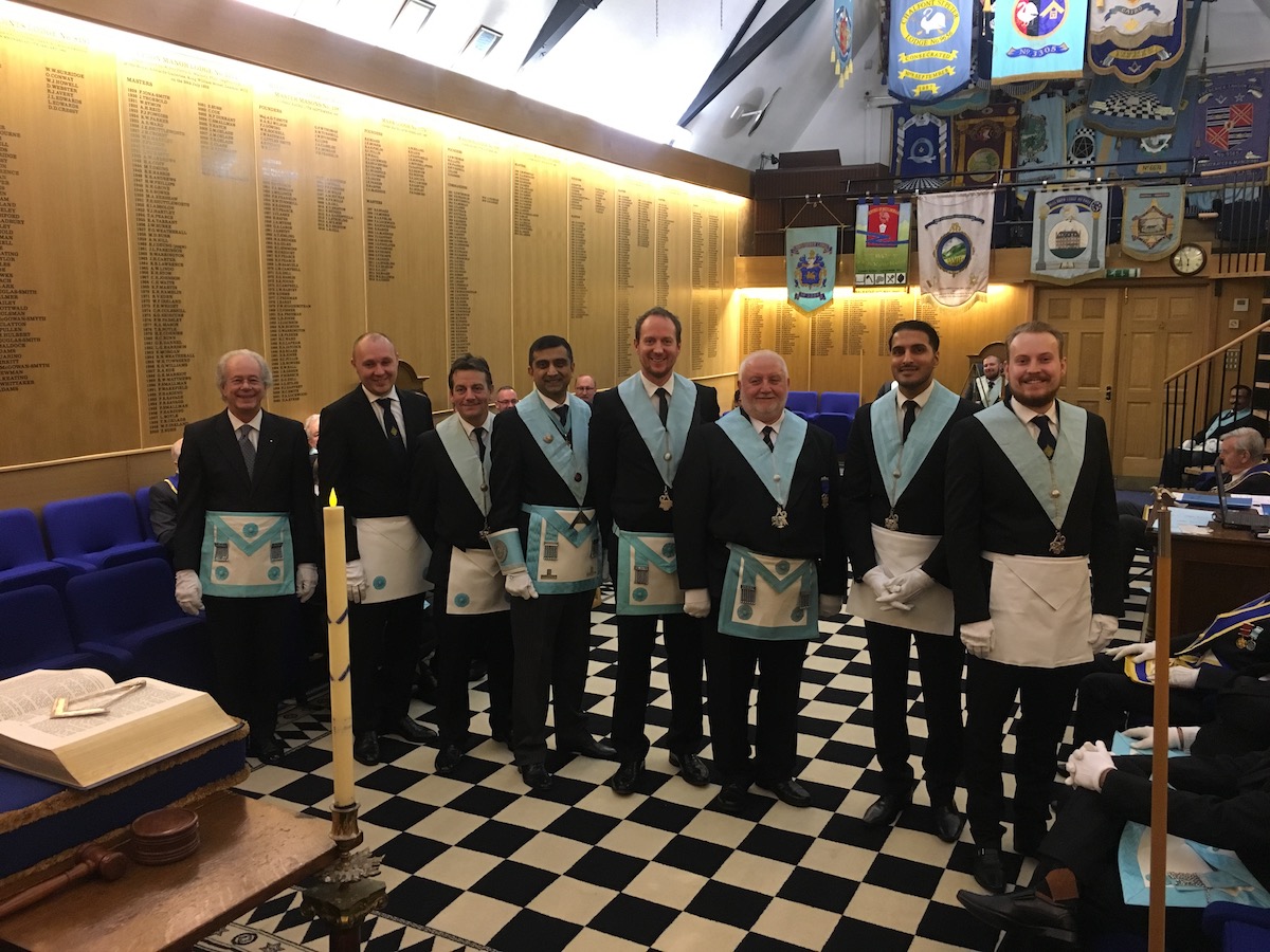 Picture shows (left to right): Bro Michael Frye – MM; Bro Paul Hathorn – FC; Bro Greg Morgan – FC; W. Bro Bobby Uppal –WM; Bro Sam Farmer – MM; Bro John Hunter – MM; Bro Amit Mehta – EA; Bro Nick Boyles – EA.