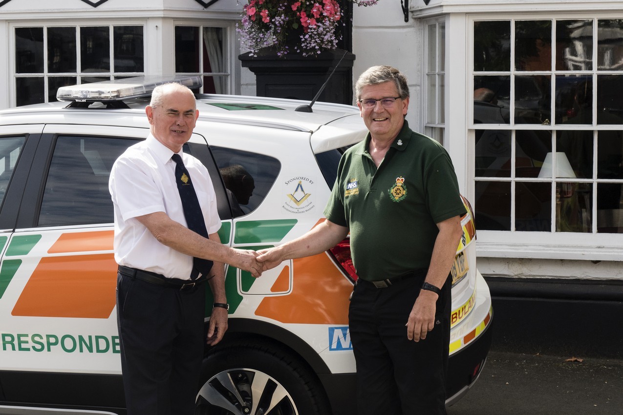 Steve Acton, Winslow Community First Responder (also local freemason of Saxon Lodge) and Dave Cave, Community engagement training officer (South Central Ambulance Service) officially received a new response vehicle to be based in Winslow from Phil Blacklaw and Tony Robinson (APGM) of Buckinghamshire freemasons.