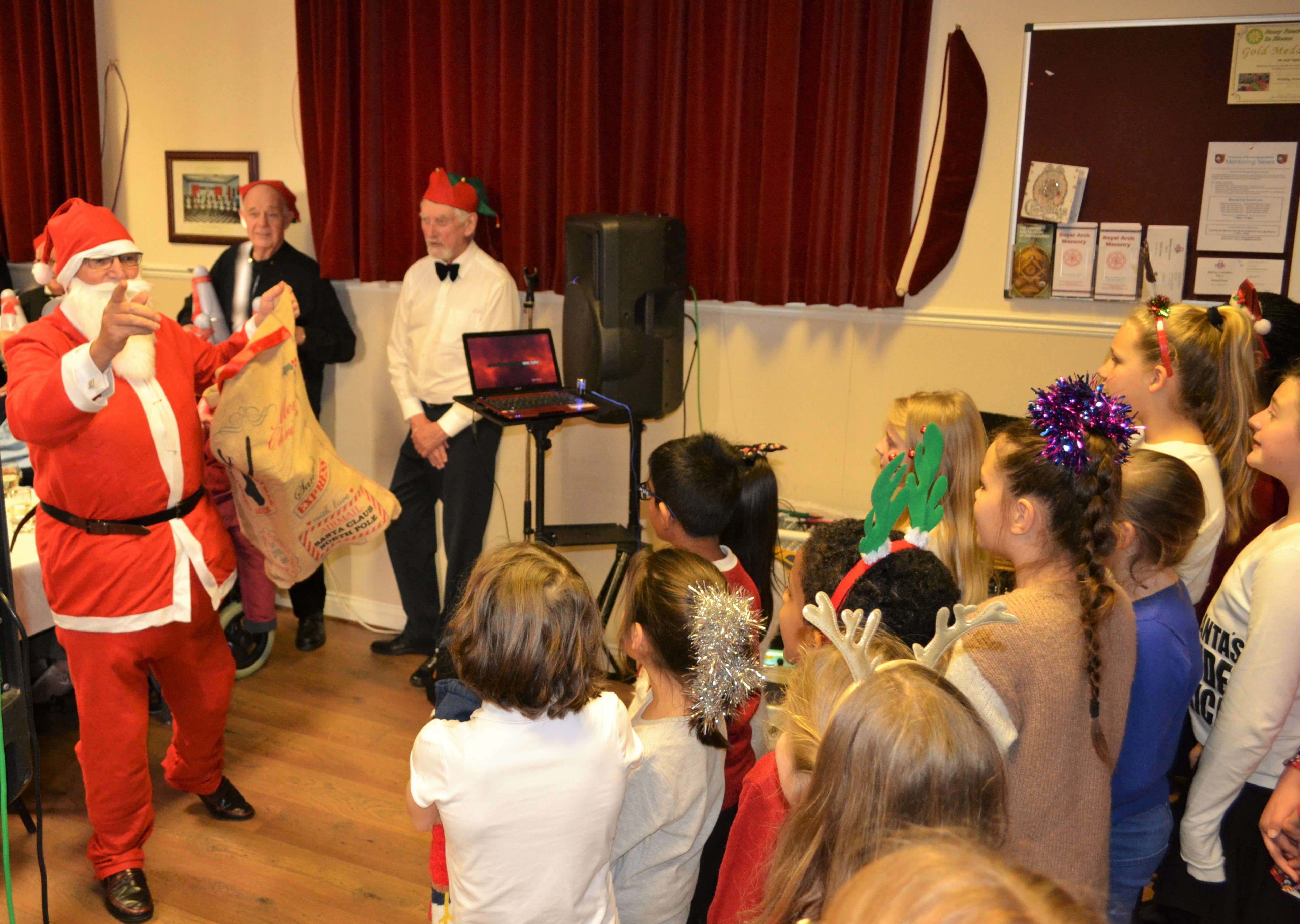 Paul French, a member of Wineslai Lodge 2435, was on hand to 'croon' a few old songs and tell some Christmas jokes, which were well appreciated by the whole audience. Father Christmas, (aka John Petrie of Roman Way Lodge), also made a surprise visit with gifts for the children, who spent time chatting with the elderly visitors before returning to their school.
