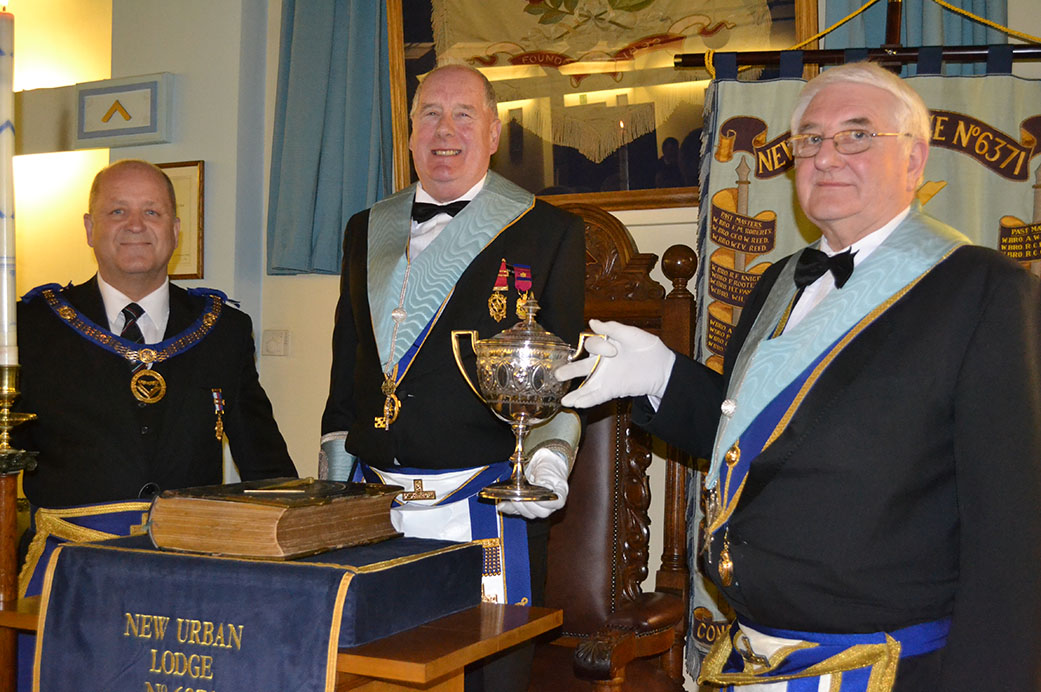 Assistant Provincial Grand Master John Clark and the Talking Heads team attended a meeting of New Urban Lodge on the 26th March 2015 when the Lodge's Loving Cup was delivered back to them after being missing for 31 years.